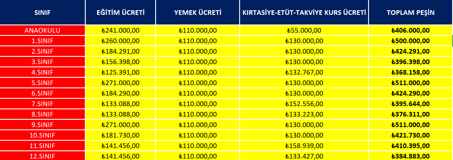2025-2026 eğitim öğretim yılına ait eğitim ücretleri aşağıda yer almaktadır. Bu rakamlar, KDV dahil peşin fiyatlardır, taksitli ödemelerde vade farkı uygulanır. Yemek ve servis ücretleri ile MEB mevzuatı gereği uygulanan genel giderler eğitim ücretine dahil değildir.